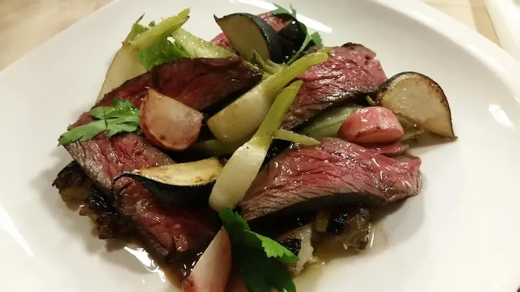 Rinderfiletstücke mit Zwiebeln, Knoblauch, Ingwer, Tomaten, Kräuter